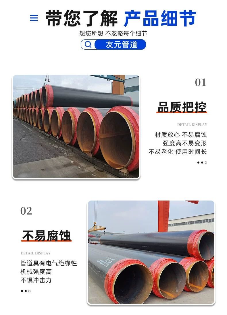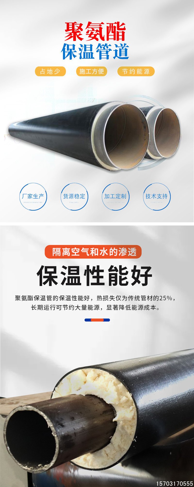 * **結(jié)構(gòu)組成**:該管道通常由鋼管基材、聚氨酯保溫層和外護層三部分組成。鋼管基材采用螺旋焊縫鋼管,通過自動埋弧焊技術制成,具有較高的強度和承壓能力;聚氨酯保溫層則通過現(xiàn)場發(fā)泡或預制方式固定在鋼管外表面,形成連續(xù)致密的保溫層;外護層則多采用聚乙烯(PE)或玻璃鋼(FRP)等防腐耐磨材料,起到保護保溫層、防止外界環(huán)境侵蝕的作用。