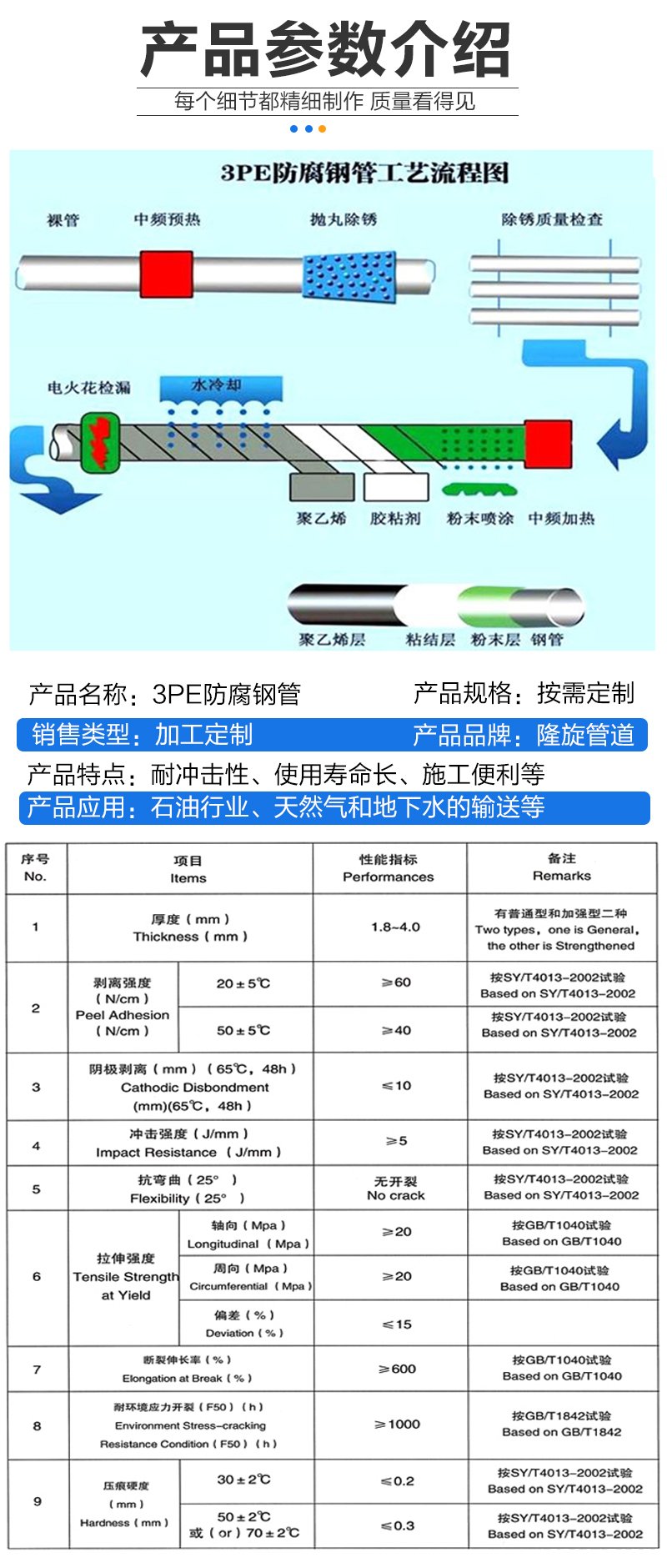 3PE/2PE 執行 SY/T4013-95 或 SY/T0413-2002《 埋地鋼質管道聚乙烯外涂層技術標準》 FBE 執行 SY/T0315-97《 鋼質管道熔結環氧粉末外涂層技術標準》