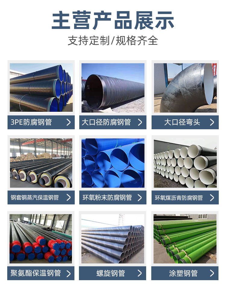 防腐鋼管用于:市政工程:適用高層建筑給水、熱網供熱、自來水工程、燃氣輸送、埋地輸水等管道。石油:石油輸送管道、化工制藥、印染等行業輸送腐蝕性介質的工藝管道。