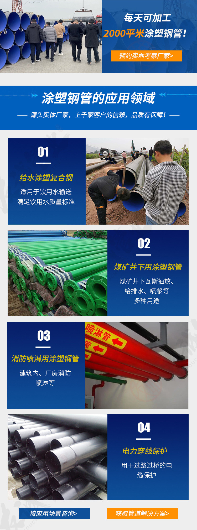 (1) 供水和排水系統:承插式涂塑鋼管可以作為供水和排水系統中的重要部件,由于其具有良好的耐腐蝕性能和使用壽命長等特點,在水利工程中得到廣泛應用。