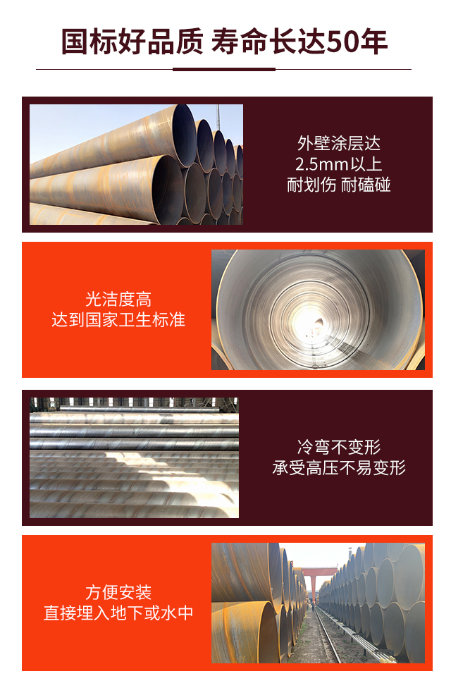 螺旋鋼管承壓能力強(qiáng),塑性好,便于焊接和加工成型;一般低壓流體輸送用螺旋縫埋弧焊螺旋鋼管(SY5037-83),采用雙面自動(dòng)埋弧焊或單面焊法制成的用于水、煤氣、空氣和蒸汽等。